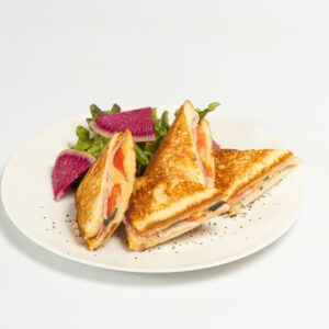 ベーコンとチーズ、トマトをサンド。あつあつを召し上がれ。