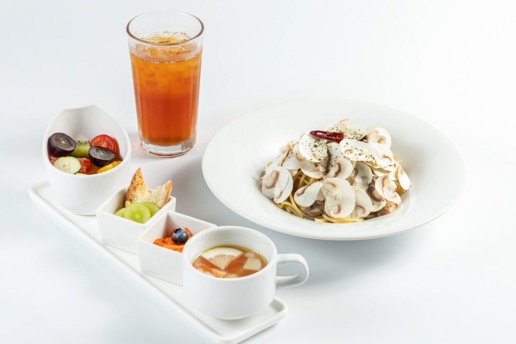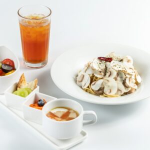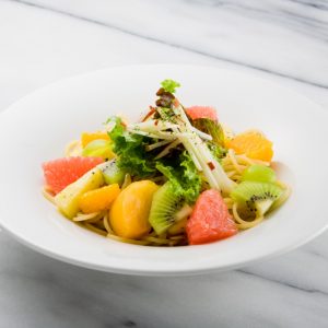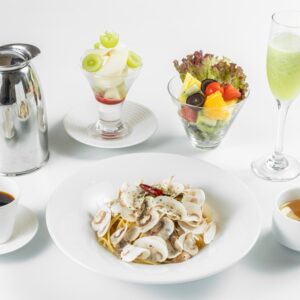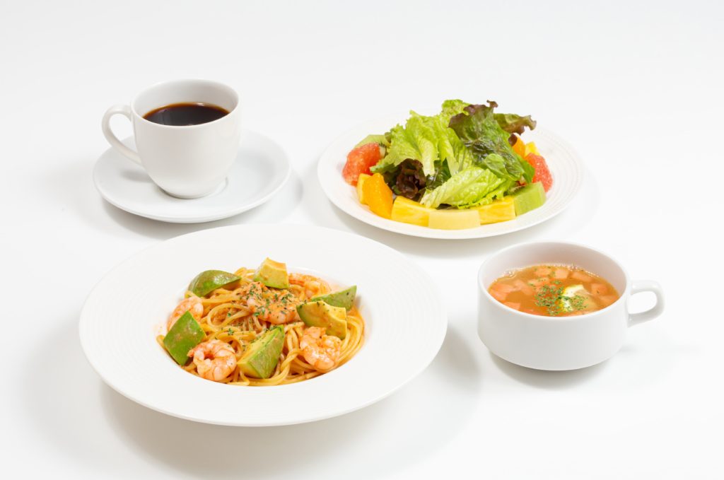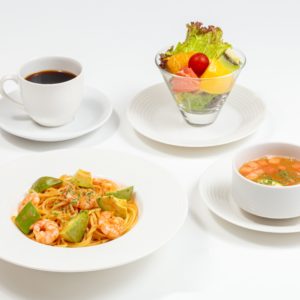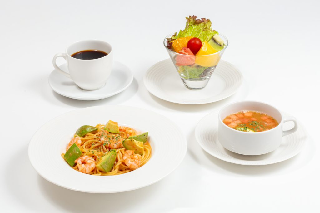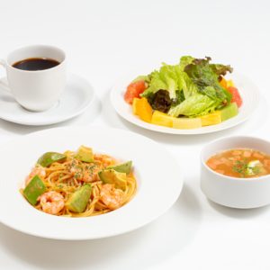 賢美フルーツサラダ、特製フルーツスープ(飲み放題)、コーヒーor紅茶(ホットorアイス)が付いたフルーツサラダランチのセットもご用意しております。