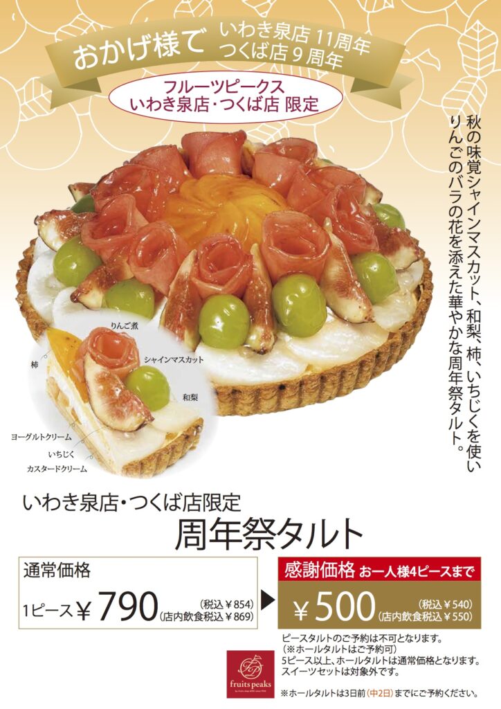 いわき泉店の11周年、つくば店の9周年を記念したお祝いのタルトです。