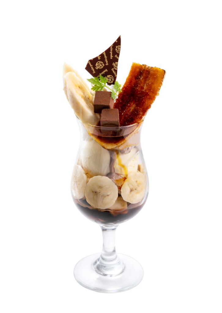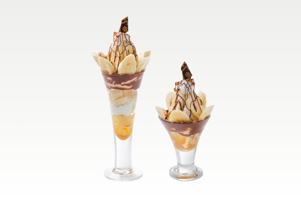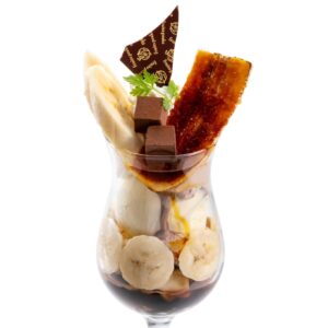 キャラメリゼしたバナナや、ほろ苦いコーヒーゼリー、塩気のある塩キャラメルくるみなども入って、食感や味の変化が楽しいパフェとなっております。