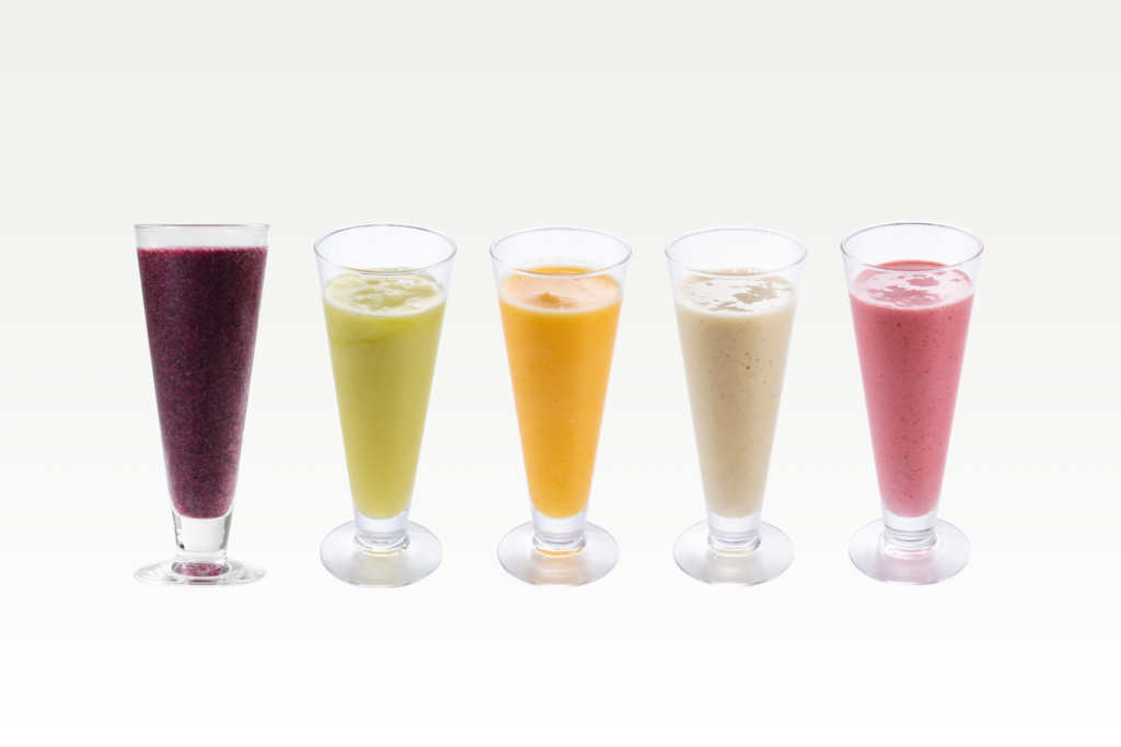 バナナミルク、いちごミルク、マスクメロン、パイン&オレンジ、季節のスムージーの5種類をご用意しております。