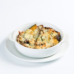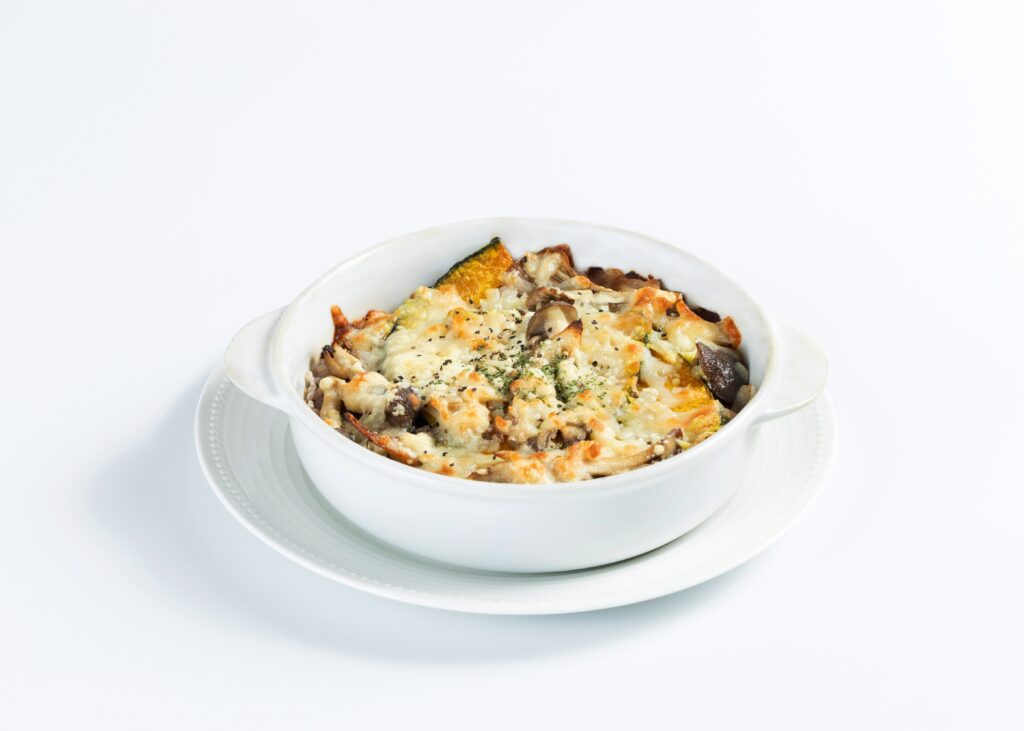 十五穀米に季節の野菜とミートソース、チーズを合わせ、オーブンであつあつに焼き上げたドリアです。